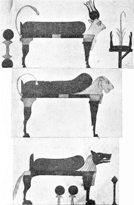 From the cultural point of view the most interesting articles of furniture found in Tutankhamen’s tomb are the three lofty couches fashioned in grotesque shapes to represent conventionalized animals, cow, lion, and hippopotamus respectively. Although such couches are thoroughly Egyptian in design and are familiar in pictures from Egypt and the Soudan, they have never been seen before. They are worth discussing in some detail, because they express the concreteness and naïvety of Egyptian belief mentioned in the last chapter in a way that brings home to us the essential distinction of the religion of the ancient dwellers in the Nile Valley.