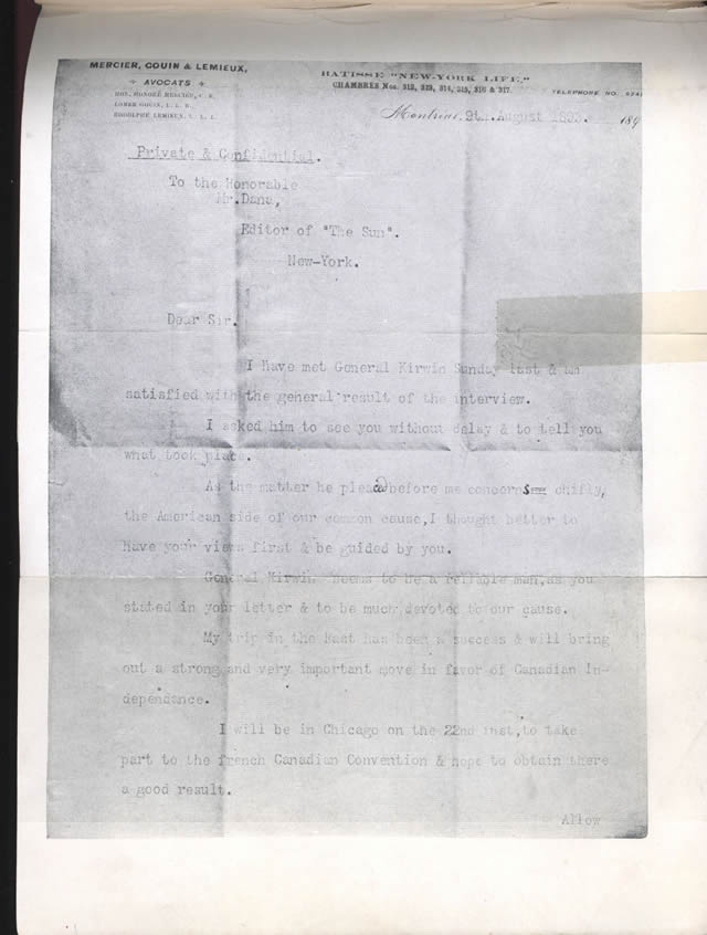 About the 18th July, 1870, Haliburton was at Niagara Falls and by chance saw Lord Lisgar, the Governor-General, and in conversation with him he learned that Sir George Cartier, Bishop Taché, and Mr. Archibald (who had been chosen as Lieutenant-Governor of the new province) were to meet him there in a few days. Haliburton suspected some plot and telegraphed warning Dr. Schultz at London, Ontario, who sent word to me, and on the 19th we had a meeting of our committee, and arranged at once for the public meeting to be held on the 22nd. In the Government organ, the Leader, of the 19th July was a despatch from Ottawa dated the 18th in the following words: