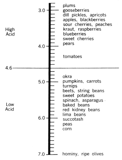 The classification of foods in the acid range below 7 is extremely important. Above pH 4.6 most of the spoilage type micro-organisms can grow, as well as the dreaded Clostridium botulinum (see discussion following on botulism). In foods with a pH greater than 4.6, it is necessary to heat-process the food at temperatures above boiling to obtain the desired level of sterility.