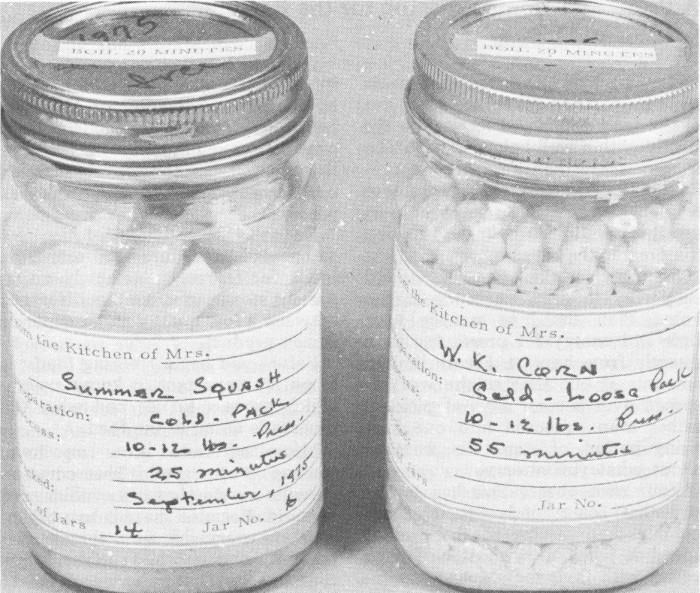 For example, pumpkin or squash can be home canned in two forms: strained or cubed. University of Minnesota research has shown that the time required for the center of a pint jar of strained squash (which heats by conduction) to reach sterilization temperature is three to four times as long as for a pint jar of cubed squash (which heats by convection). The same is true of creamed corn (heats by conduction) and whole kernel corn (heats by convection).