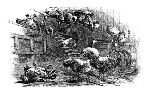 [21]“Oh, it is only Peck in her spasms,” croaked out two or three sleepy old hens.