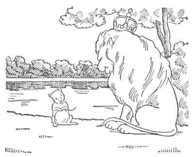 [10]Then he found King Leo on the bank, all ready to receive visitors. He was wearing his crown tipped on the back of his head because he felt happy. He smiled at Robin Rat as pleasant as you please, and asked him to stay to supper.