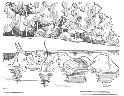 All the Beasts were lying on the bank of the river. Far away they heard the little, thin voice of Tommy Tortoise singing his song. They pricked up their ears, looking this way and that way as they listened.