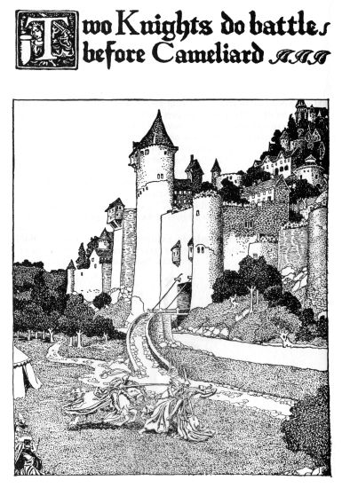 So King Arthur and Boisenard went in the direction that Boisenard had beheld the light, and by and by they came out of the forest and into an open place where they beheld a very great castle with several tall towers, very grim and forbidding of appearance. And it was from this castle that the light had appeared that Boisenard had seen. So they two rode up to the castle and Boisenard called aloud and smote upon the gate of the castle. Then immediately there came a porter and demanded of them what they would have. Unto him Boisenard said, “Sirrah, we would come in to lodge for to-night, for we are a-weary.” So the porter said, “Who are you?”—speaking very roughly and rudely to them, for he could not see of what condition they were because of the darkness. Then Boisenard said, “This is a knight of very good quality and I am his esquire, and we have lost our way in the forest and now we come hither seeking shelter.”