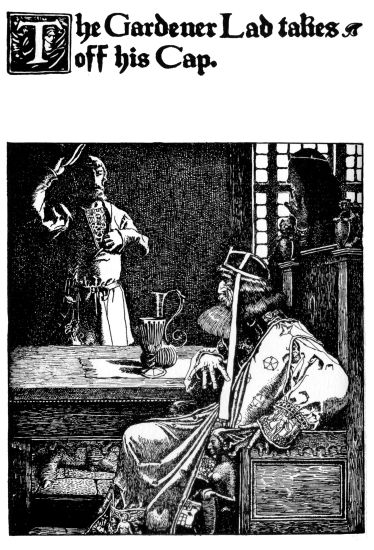 Then, of a sudden, the knight said to King Arthur, “Messire, thou art young and lusty of spirit and I doubt not but thou hath a great heart within thee. What say you now to a little sport betwixt us two?” Upon this King Arthur regarded that knight very steadily and he believed that his face was not so old as it looked; for his eyes were exceedingly bright and shone like sparks of light; wherefore he was a-doubt and he said, “Sir, what sport would you have?” Upon this the knight fell a-laughing in{298} great measure and he said, “This is a very strange sport that I have in mind, for it is this: That thou and I shall prove the one unto the other what courage each of us may have.” And King Arthur said, “How shall we prove that?” Whereunto the knight made reply, “This is what we shall do: Thou and I shall stand forth in the middle of this hall, and thou shalt have leave to try to strike off my head; and if I can receive that blow without dying therefrom, then I shall have leave to strike thy head off in a like manner.”