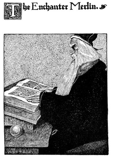 Now the day before King Arthur was to keep his covenant at that castle, he was wandering through the adjacent forest in great travail of soul, for he wist not what he should do to save his life. As he wandered so, he came of a sudden upon a small hut built up under an overhanging oak-tree so that it was very hard to tell where the oak-tree ended and the hut began. And there were a great many large rocks all about covered with moss, so that the King might very easily have passed by the hut only that he beheld a smoke to arise therefrom as from a fire that burned within. So he went to the hut and opened the door and entered. At first he thought there was no one there, but when he looked again he beheld an old woman sitting bent over a small fire that burned upon the hearth. And King Arthur had never beheld such an ugly beldame as that one who sat there bending over that fire, for her ears were very huge and flapped, and her hair hung down over her head like to snakes, and her face was covered all over with wrinkles so that there were not any places at all where there was not a wrinkle; and her eyes were bleared and covered over with a film, and the eyelids were red as with the continual weeping of her eyes, and she had but one tooth in her mouth, and her hands, which she spread out to the fire, were like claws of bone.