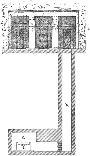 Auch dieses Grab war bereits von Arabern in den früheren Jahrhunderten geöffnet und seines beweglichen Inhaltes mit Ausnahme der nackten königlichen Leiche beraubt worden. Selbst einzelne Stellen der Wände hatte man durchschlagen, zum großen Schaden der darauf befindlichen Inschriften, in der Meinung, daß die vergeblich gesuchten Schätze dahinter verborgen sein müßten.