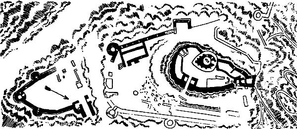mount-and-bailey plan, 42-47, 48-52, 55-56, 112, 113, 160, 161;