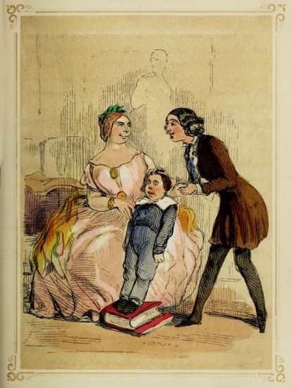 His little wife was charming—to see her in pink, with some miniature Dixons in pink too, round about her, or in that beautiful grey dress, with the deep black lace flounces, which she wore at my Lord Comandine’s on the night of the private{32} theatricals, would have done any man good. To hear her sing any of my little ballads, “Know’st thou the Willow-tree?” for instance, or “The Rose upon my balcony,” or “The Humming of the Honey-bee” (far superior, in my judgment, and in that of some good judges likewise, to that humbug Clarence Bulbul’s ballads)—to hear her, I say, sing these, was to be in a sort of small Elysium. Dear, dear, little Fanny Dixon! she was like a little chirping bird of Paradise. It was a shame that storms should ever ruffle such a tender plumage.