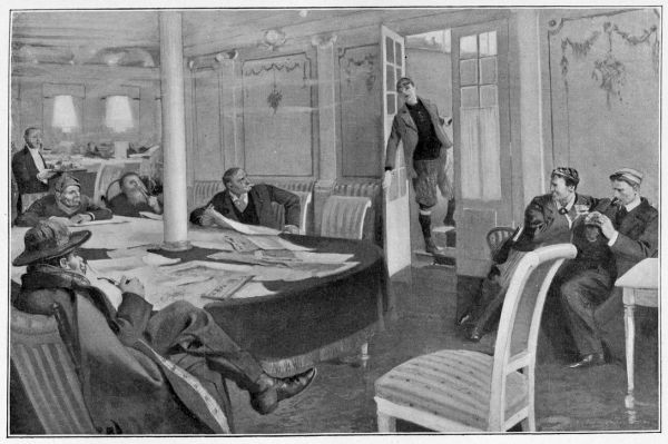 La porte du fumoir exposée au vent venait de rester ouverte au brouillard de l'Atlantique Nord, et le grand paquebot continuait à rouler et tanguer, sifflant pour avertir la flottille de pêche.