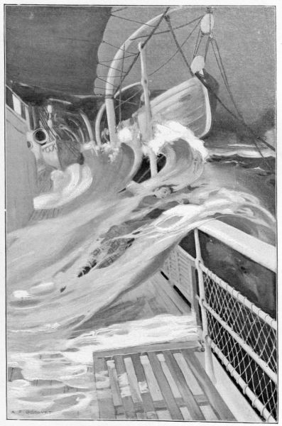 Harvey s'en alla en chancelant sur les ponts humides jusqu'à la lisse la plus proche. Il se sentait très malheureux; mais il vit le stewart du pont en train d'amarrer des chaises ensemble, et, comme il s'était vanté devant cet homme de n'avoir jamais le mal de mer, son orgueil le fit aller tout au bout du pont, passé le salon des secondes, à l'arrière, lequel se terminait en dos de tortue. Le pont était désert, et il se traîna tout à l'extrémité, près du mât de pavillon. Là, il se plia en deux dans tout l'abandon de l'agonie, car le Wheelingstogie se joignait à la houle et à la vibration de l'hélice pour lui arracher l'âme. Il lui sembla que sa tête enflait; des étincelles lui dansèrent devant les yeux; son corps lui parut diminuer de poids, pendant que ses talons flottaient au gré du vent. Il perdait connaissance sous l'effet du mal de mer, et un coup de roulis le souleva par-dessus la lisse jusque sur le rebord uni du dos de tortue. Alors une grosse vague mélancolique et grise sortit du brouillard en se balançant, prit pour ainsi dire Harvey sous le bras, et l'entraîna au loin dans la direction du vent. La grande verte se referma sur lui, et il s'en alla tranquillement dormir…