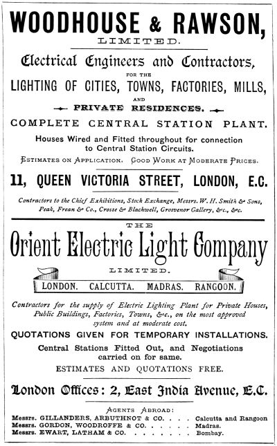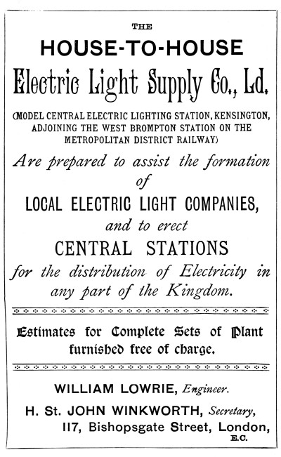 The art of lighting by Electricity practically dates from ten years ago, and it has during that period received the constant attention of both Electrical Engineers and others, who have applied the greatest scientific knowledge. The result of all this energy appears to be discouraging. Five hundred thousand pounds have been subscribed to carry on the business, and it is doubtful whether the companies which survive have a market value of one-tenth of that sum. The experience may have been bought too dearly, but the era of Central-Station Electric Lighting, which has now commenced, ought to re-establish the position of Electricity in financial circles, and afford a safe and profitable outlet for the surplus capital of the investor who buys gas and water shares to pay four per cent.