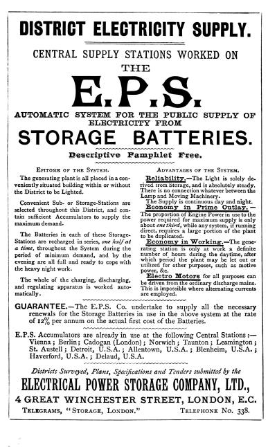 A small installation at Kensington Court, erected two years ago, for the purpose of supplying the houses in the immediate neighbourhood, has rapidly developed, and underground mains have been led in many directions from the station, and a constant service of electricity is provided for by means of secondary batteries. As this is the first practical exposition of the secondary batteries’ system of distribution, it is proposed to describe the installation under that head. Central-stations are also at work in Liverpool, Leamington, Taunton, Exeter, and there are also five large installations nearly completed in London, besides the Kensington Court station, all of which will probably be in full swing before the end of the year.