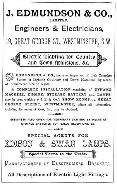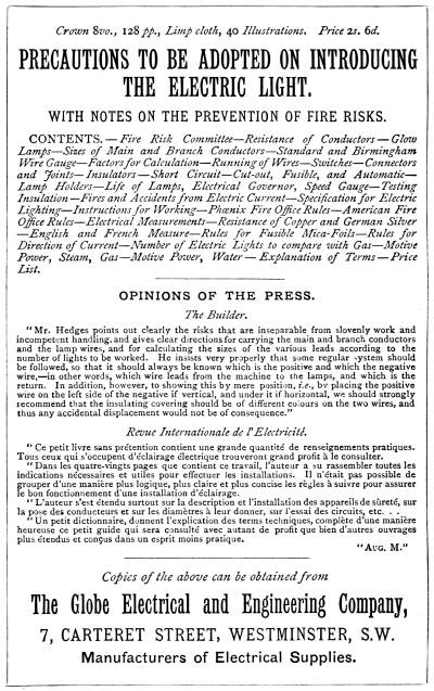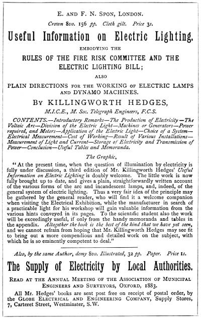 [4] Hedges on the Supply of Electricity by Local Authorities. Proceedings of Association of Municipal and Sanitary Engineers and Surveyors, vol. ix. (1882-83), p. 159.