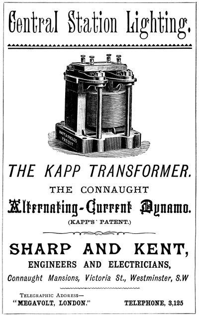 Much credit is due to M. Goulard, who, in spite of great opposition to the use of his transformer system, initiated the Grosvenor Gallery installation three years ago. It has developed into not only the largest and most important central-station in Europe, but, as regards the transformer system, it supplies more lights than any in the United States. The original company has been taken over by the London Electric Supply Corporation, who are putting down plant capable of maintaining 30,000 lights, and are erecting another station at Deptford for 200,000 lights, which will be distributed by means of district transformers from mains, which it is proposed to run from Deptford through the Thames Tunnel and the Underground Railways. The electric current is supplied by meter at the price of 7¼d. per Board of Trade Unit, a price for light equal to gas at about 4s. 2d. per 1000 cubic feet.