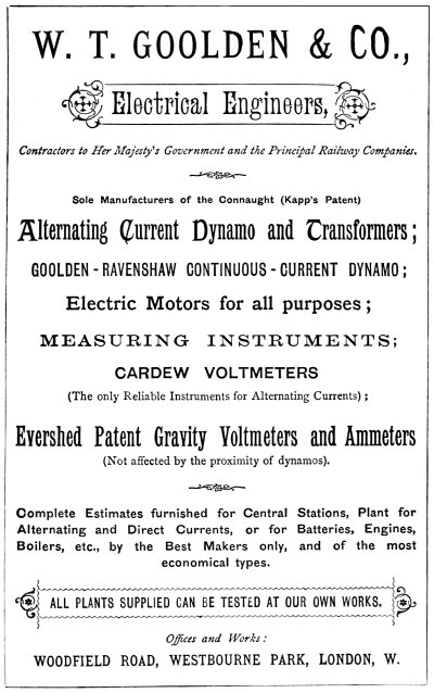 The problem of electric lighting from central-stations is comparatively easy if an area can be obtained immediately surrounding, and within a short distance of, the station, with a right of way for laying down the electric mains direct. This happy state of affairs has not yet been attained, consequently the generating station has more often to be in an out-of-the-way corner of the district to be lighted, and it would be financially impossible to use low-tension currents with correspondingly large mains. The difficulty has been overcome in several ways by the use of high-tension currents in the mains, and has led to the adoption of secondary generators or transformers of electricity, which by induction supply a current of low potential in the house-service. The first to make this plan a practical success was Mr. Goulard, to whom the honour of the introduction is due, although his claims as the first inventor have been recently upset by the decision of the Courts.