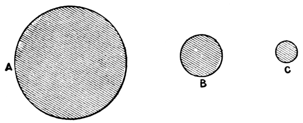 The relative economy of the supply of electricity by the use of a transformer is clearly shown by the following diagram, Fig. 7. A, B, and C give proportionately the area of cross section of the total mass [Pg 22] of copper necessary to supply 5000 16 candle-power glow lamps situated at a mean distance of 4000 feet from the dynamo. A refers to the Edison “three-wire” system, working at a potential or electrical pressure of 200 volts with a fall of potential or loss of energy in the distributing feeders of 10 per cent., average distance from dynamo 4000 feet—the usual conditions on which this system is worked. B shows the size of conductor required for the same work in an installation based on the transformer system, potential 1000 volts, allowing 2·5 per cent. loss in the supply mains—only one-fourth as much as in the direct Edison system at the same average distance from dynamo. If this loss were increased to 10 per cent., and made equal to that in the direct system, viz. 10 per cent., the size of the conductor would be that shown at C.