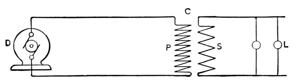 Fig. 9 a shows the arrangement of the two separate and complete circuits. D is the dynamo, P the primary coil, S the secondary, and L the lamps arranged in parallel.