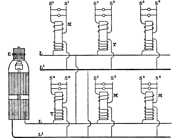 L L¹, main primary conductors; | S¹ S² S³ S⁴ S⁵ S⁶, lamps in parallel. |