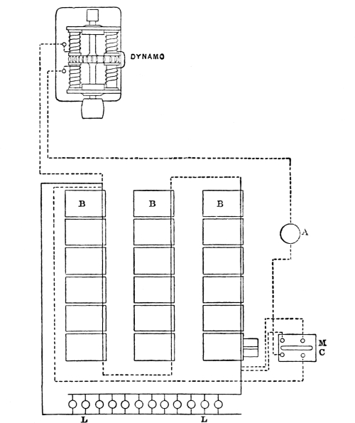 Before describing the central electric light station at the former city, it may be well to recall to mind that the Edison plan is the combination of a number of machines which pump electricity into a network of feeders, mains, and conductors, the lamps being placed in parallel circuit, as shown at L l, Fig. 16, and maintained at a constant potential of 110 volts.