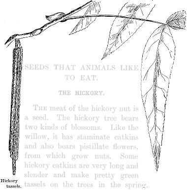 The meat of the hickory nut is a seed. The hickory tree bears two kinds of blossoms. Like the willow, it has staminate catkins and also bears pistillate flowers, from which grow nuts. Some hickory catkins are very long and slender and make pretty green tassels on the trees in the spring. Hickory nuts are good to eat, and you may wonder how these delicious nuts, that many creatures are fond of, ever get a chance to grow.