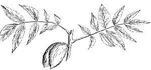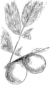 The nuts have hard, thick, black shells, and also a softer outer covering, or rind, that is very bitter and disagreeable to the taste, and that stains the fingers a dark brown.