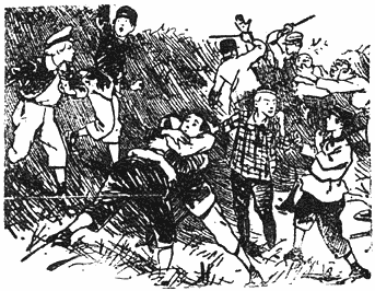 De kersen inspecteur pakte haastig zijn pan op en sjokte verder in de richting van de maaiwei. Onder langs den dijk sloop Jan den nalatigen etensdrager achterna. Dicht bij de wei sprong hij met het eten van Teun in zijn pan over een sloot en langs een dichte heg kwam hij vlak bij den meidoorn, waar Teun Driedijk met een hollen buik en half scheel [17]van den honger naar zijn jongen stond uit te kijken.
