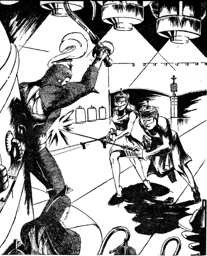 "A ray-gun!" cried Moore. His incautious exclamation was their undoing. A half-clad foundry worker, looking like a gnome in his eye-shade helmet and drooping gauntlets, gaped at them. Ross shot a split second too late to stop the shout of alarm. The foundryman dropped, but a dozen soldiers came on the run. Moore and Ross fired and fired again, but they went down in a charge of scores of Horta soldiers. The flat of a sword struck Ross a stunning blow on the side of his head.