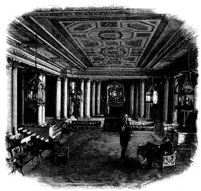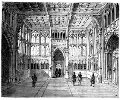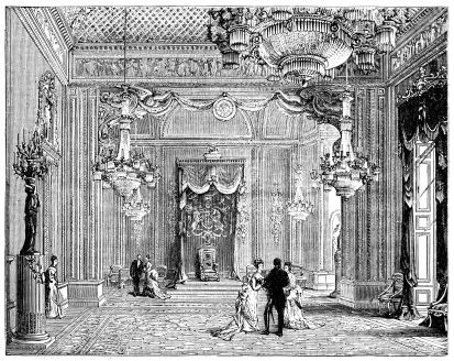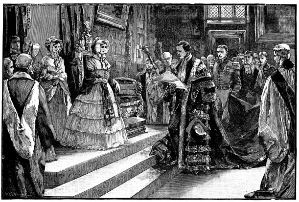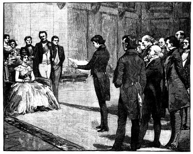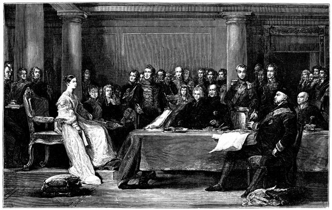 In the dawn of June 20th, 1837, immediately after the death of King William IV., the Archbishop of Canterbury (Dr. Howley) and the Lord Chamberlain (the Marquis of Conyngham) left Windsor for Kensington, to convey the tidings to his late Majesty’s successor. They reached the Palace about five o’clock in the morning, and knocked, rang, and beat at the doors several times before they could obtain admission. When at length the porter was aroused, the visitors{2} were shown into one of the lower rooms, where a long time passed without any attention being paid them. Growing impatient, they rang the bell (as we read in the interesting narrative of Miss Wynn), and desired that the attendant on the Princess Victoria might be sent to inform her Royal Highness that they requested an audience on business of importance. Another long delay ensued, and again the bell was rung, that some explanation might be given of the difficulty which appeared to exist. On the Princess’s attendant making her appearance, she declared that her Royal Highness was in so sweet a sleep that she could not venture to disturb her. It was now evident that stronger measures must be taken, and one of the visitors said, “We have come on business of State to the Queen, and even her sleep must give way to that.” The attendant disappeared, and a few minutes afterwards the young sovereign came into the room in a loose white robe and shawl, her fair hair falling over her shoulders, her feet in slippers, her eyes dim with tears, but her aspect perfectly calm and dignified.[1] Lord Melbourne, the Prime Minister, was at once sent for, and arrived at nine o’clock, when, after an interview of half an hour with the Queen, he addressed himself to a rapid study of the ceremonials to be observed at the approaching Privy Council. Some time after, the Lord Mayor and other members of the Corporation reached the Palace, and the chief members of the Privy Council soon thronged the rooms.
