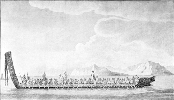 Am 26. Januar steuerten wir vom Kap Horn ab. Am 13. Februar befanden wir uns 12° westwärts von der Magelhaensstraße. Erst am 4. April sichtete Peter Briscoe, ein Diener Banks', im Süden Land. Ich richtete sogleich meinen Kurs dahin und fand, daß es sich um eine eiförmige Insel handelte, in deren Mitte sich eine Lagune befand. Ich taufte sie deshalb die Laguneninsel. Die kupferfarbigen Bewohner dieser Insel sammelten sich am Strande und trugen große Spieße, mit denen sie aufgeregt hin und her liefen. Um ein Uhr steuerten wir nach Nordwesten und entdeckten eine neue Insel, die ich Thrumbkap nannte. Um drei Uhr fanden wir eine armbrustartige Insel, die bewohnt war; ich hieß sie die Bow-Insel, Bogen-Insel. Am 6. entdeckten wir verschiedene Eilande, die ich die »Gruppen« nannte, am 7. die Vögelinsel, am 8. die Ketteninsel, am 10. Maitea, die Kapitän Wallis[S. 9] zuerst entdeckt und die Osnabrückinsel genannt hatte. Am folgenden Morgen früh entdeckten wir Otahiti. Um 11 Uhr waren wir so nahe, daß verschiedene Kähne mit Eingeborenen, die Palmzweige mit sich führten, uns anliefen und uns die Zweige als Friedenszeichen überreichten. Am nächsten Morgen um 7 Uhr gingen wir in der Port Royal Bai, die von den Eingeborenen Matavai genannt wird, vor Anker. Die Eingeborenen umringten das Schiff sofort mit ihren Kähnen und brachten uns Kokosnüsse, Äpfel, Brotfrüchte und Fische, die sie uns für Glaskorallen und andere Kleinigkeiten überließen. Unter ihnen befand sich Owhah, ein alter Häuptling, den die früheren Begleiter des Kapitäns Wallis, Herr Gore und andere, die mich auf meiner Reise begleiteten, sofort erkannten. Ich lud den alten Herrn an Bord und machte ihm einige Geschenke. Zugleich ordnete ich durch einen Befehl den Verkehr meiner Leute mit den Eingeborenen, um Preisdrückereien und anderem vorzubeugen. Hauptsächlich untersagte ich, daß Waren gegen irgend etwas anderes als Lebensmittel umgetauscht werden sollten.