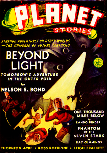 The Phantom of the starways! That was the crux of my being here on the Seven Stars. Weird, mysterious thing—no wonder the Earth, Mars and Venus governments had not dared let it get any publicity which they could possibly avoid. For three months now, this Earth-year of 2170, mysterious accidents had been happening to commercial space-ships. Non-arrival at destination, and then later found by the Interplanetary Patrol, derelicts in space. Gruesome damn' thing. A ship unharmed, save that its air was gone. As though some mysterious accident had broken one of the pressure valves, or deranged the machinery of an exit-porte, so that the air had all hissed out. Ship of the dead. Everyone aboard lying asphyxiated.