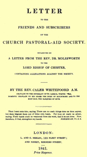 The Rev. Dr. Molesworth, a Clergyman favourably known for some time past by the publication of a periodical called the “Penny Sunday Reader,”—who is likewise (as I perceive by the Advertisement appended to his Pamphlet) Author of “Family Sermons for every Sunday in the Year,” and whose promotion from a small benefice in Canterbury to one of the largest in the North of England was not long ago announced to the public,—has lately signalized his zeal in another way, by coming forward in the character of public prosecutor [3] against the “Church Pastoral-Aid Society:”—this he does in a printed Letter addressed to his own Diocesan, and our respected Vice Patron, the Bishop of Chester, containing serious charges affecting the whole character and management of the Society.