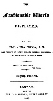 p. 25There is a perpetual reciprocation of numbers between them and the society in which they reside. Scarcely an hour passes without some interchange. The gossip of every day announces that some have migrated from the region of Fashion, and that others have made their appearance within it for the first time. The causes which produce these variations, and the reasons by which they are defended, are in some instances too mysterious, and in others too frivolous, to become subjects of recital. In general it may be affirmed, that though persons become Fashionable with the concurrence of their will, they cease to be such against it. For, if a few accidental converts to plain sense and sober piety be excepted, the greater part of those who retire have been p. 26superseded; and resign their places, only because they cannot any longer retain them. However that be, the fluctuation thus occasioned in the numbers and characters of those who compose this Fashionable Community, diversifies its complexion daily; and renders a precise account of its population and totality utterly impossible.