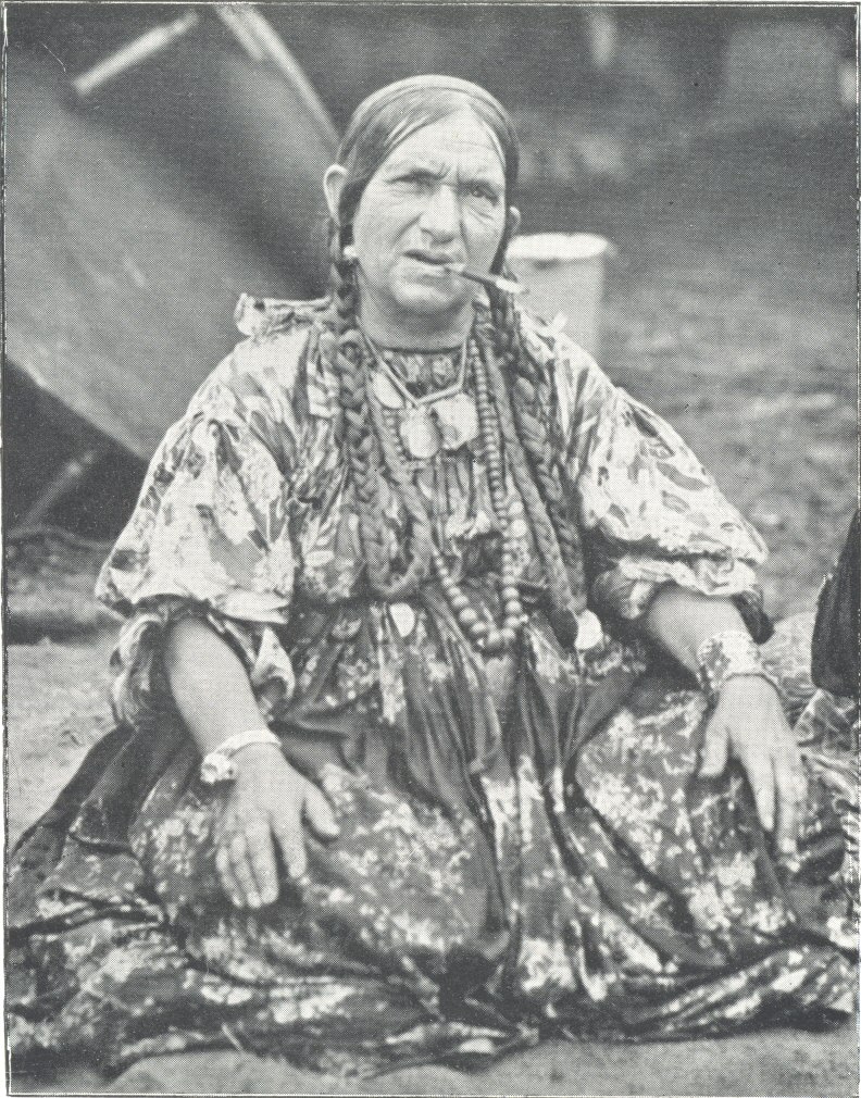p. 5Meanwhile a spectator passing along Green Lane, Tranmere, might have seen a very curious spectacle in the English Gypsies’ camp, for that was the destination of the aliens. On a bare patch of cindery earth between the dark brown tents of the Boswells and Robinsons, a piece of carpet had been spread, and on it, as advanced guard awaiting the main body, sat portly Tinka, the chief’s wife. Cross-legged, motionless, aloof, her eyes fixed on a distant infinity, quite alone yet totally unconcerned, she smoked her cigarette calmly in a long meerschaum holder. Red-robed as ever, wearing an immense weight of solid gold, brilliant as a flame, she contrasted strangely with the dingy colouring of the place: a Chinese idol in a Methodist chapel would have been less incongruous. But the English Gypsies, aping her detachment, feigned absence of interest; no one was visible—nevertheless many an eye was eagerly pressed to a hole in the tent-blanket.