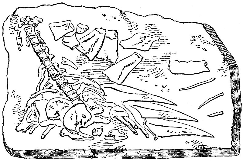 The discovery of this genus forms one of the most important additions that geology has made to comparative anatomy. Baron Cuvier deemed “its structure to have been the most singular, and its characters the most monstrous, that had been yet discovered amid the ruins of a former world.” To the head of a lizard it united the teeth of a crocodile, a neck of enormous length, resembling the body of a serpent, a trunk and tail having the proportions of an ordinary quadruped, the ribs of a chameleon, and the paddles of a whale. “Such,” writes Dr. Buckland, “are the strange combinations of form and structure in the Plesiosaurus, a genus, the remains of which, after interment for thousands of years amidst the wreck of millions of extinct inhabitants of the ancient earth, are at length recalled to light by the researches of the geologist, and submitted to our examination, in nearly as perfect a state as the bones of species that are now existing upon the earth.” (Op. cit., vol. v. p. 203).