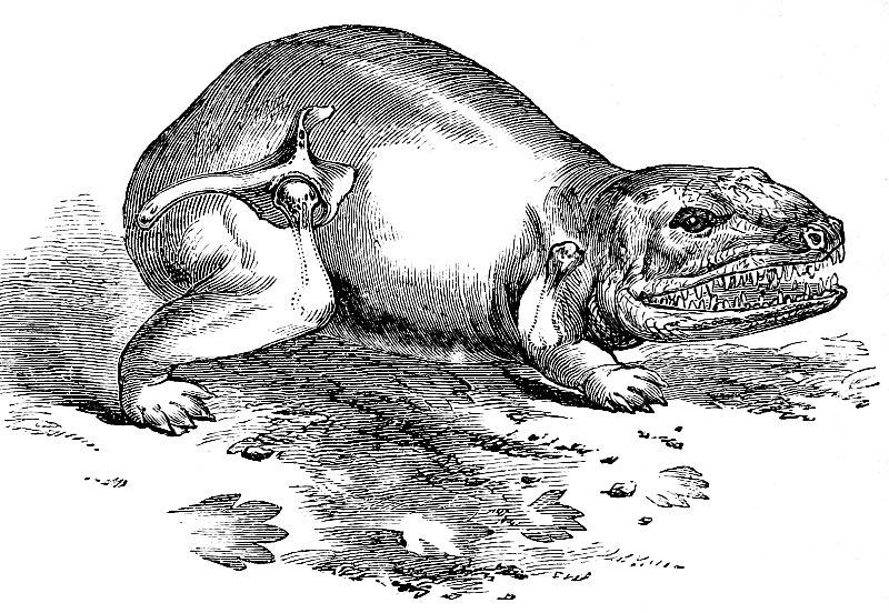 There are some very rare and remarkable extinct animals of which only the fossil skull and a few detached bones of the skeleton have been discovered: in most of these the restoration has been limited to the head, as, for example, in the case of the Mosasaurus; and only in two instances—those, viz., of the Labyrinthodon and Dicynodon—has Mr. Hawkins taken upon himself the responsibility of adding the trunk to the known characters of the head, such addition having been made to illustrate the general affinities and nature of the fossil, and the kind of limbs required to produce the impressions of the footprints, where these have been detected and preserved in the petrified sands of the ancient sea-shores trodden by these strange forms of the Reptilian class.