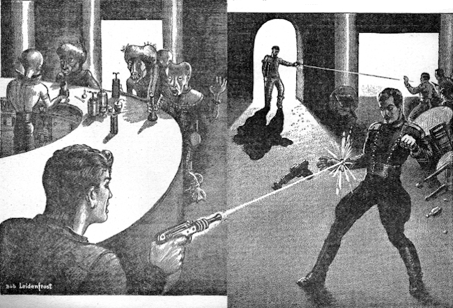 He leaned indolently back in his chair, his clear gaze utterly guileless, a lazy hint of careless laughter lifting the corners of his mobile lips. He tightened the muscles of his belly, shifting the gun-belt a bit until the dis-gun lay flat along his thigh. He felt mocking laughter bubbling in his throat, when he saw the IP men moving inconspicuously about the night club, their keen gaze searching patiently and eagerly every shadowed corner. The Martian padded silently away.