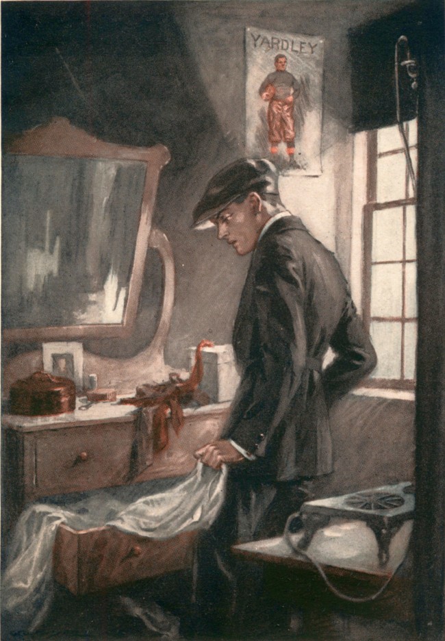 The room was small, with a ceiling that sloped with the roof, and rather shabby. There was an iron cot at one side, and a small steamer trunk peeped out from beneath it. A bureau, grained in imitation of yellow oak, was across the room and bore a few photographs in addition to such purely useful articles as brushes and a comb and a little china box holding studs and sleeve-links. The room contained two chairs, although at first glance one seemed quite sufficient for the available space: an armchair boasting the remains of an upholstered seat and a straight-backed affair whose uncompromising lines were at the moment partly hidden by a suit of blue serge. The one remaining article of furniture was a deal table such as one finds in kitchens. It was a good-sized table and it stood against the wall at the right of the window embrasure and under the gas bracket. From the bracket extended a pipe terminating at a one-burner gas stove which, on a square of zinc, adorned one end of the table. On the stove was a smoothing iron of the sort known to tailors as a goose. A second such implement[3] was being pushed back and forth over an expanse of damp cloth in a little cloud of steam, hissing, but less alarmingly than the other sort of goose, and filling the room with a not unpleasant odor. The iron didn’t stop in its travels to and fro, but its manipulator, a well-set-up boy of fifteen with very blue eyes and red-brown hair, looked around as the visitor entered.
