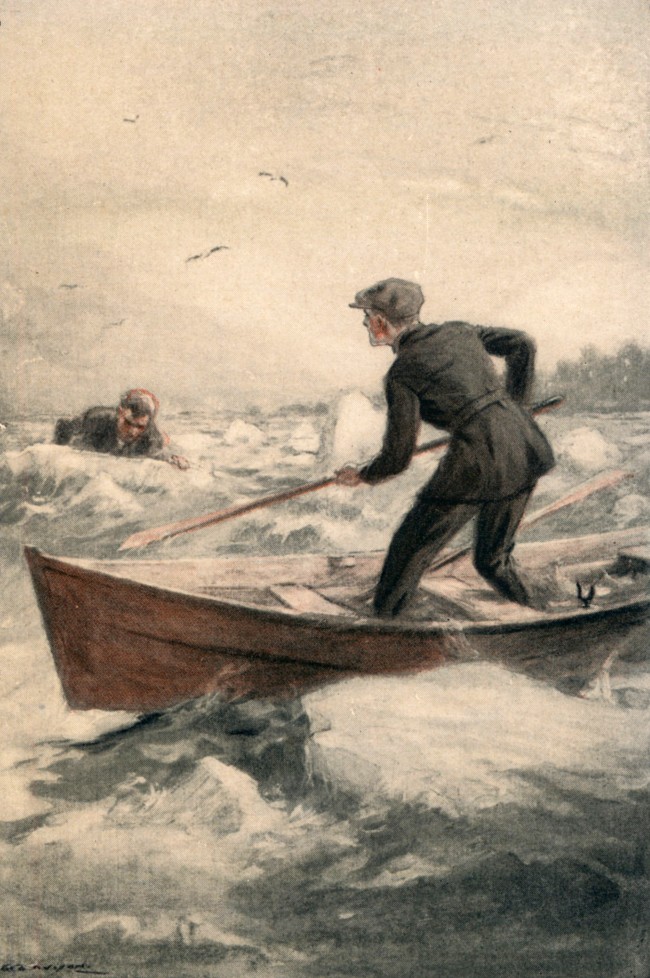 Over turned the ice-cake and the boy’s body settled with it into the water, but one straining hand was on the gunwale and Toby had secured a tight hold on his jacket. The skiff careened as the ice-cake slowly righted again, Toby pulled with every ounce of strength remaining in his body and, somehow, the boy came sprawling, inch by inch, into the boat to lie finally face-up in six inches of water on the bottom while Toby, scarcely knowing what he did, fixed his oars again and pulled mechanically for the shore. And as he labored with lungs bursting, muscles aching and eyes half-closed the perfectly absurd thought came to him that Tommy Lingard’s clothes would certainly need pressing to-morrow!