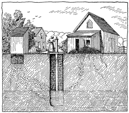 The next subject to claim our attention is the protection of the sources of drinking water. In the country water is, as a rule, obtained from wells and springs. The important bearing upon well water of soil purity demands a few explanatory remarks concerning the origin of well water. Wells are excavations made into the ground to a variable depth until water is reached. This water is denominated ground or subsoil water. Its origin may be better understood if, for the moment, we conceive the surface of the earth as more or less irregular and entirely impervious to water. The rain would collect on this surface and form lakes, ponds, and streams, according to the configuration of the surface. If, now, we conceive this surface covered with sand or other porous earth to a greater or lesser height, and the top of this be considered the earth's actual surface, the water will remain in the same position, but it will be buried within and fill the pores of the overlying soil as subterranean lakes, ponds, and streams. In digging a well we remove this porous layer of earth until we reach these subterranean streams or reservoirs of ground-water. If the above description be thoroughly understood, the condition under which well water may be obtained at different depths will become intelligible, and it will also appear plain why ground-water may flow as any surface stream and pick up on its way various substances which have percolated into the ground.