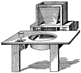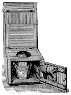 The dry-earth closet.—The dry conservancy system is a much better method of disposal of excrement, and is extensively in use to-day even in certain large cities on the Continent of Europe where sewers have not yet been introduced. This consists in the main of the frequent removal of excreta in the country by some man servant or member of the family; in villages and towns according to some cooperative plan. « 9 » This system has taken various directions, according to circumstances. Thus there are what is called the pail system, which consists in the daily or less frequent removal of a pail receiving the excreta; and the earth closet invented by the Rev. Henry Moule, of England, the chief feature of which consists in the covering of the excreta with some absorbent substance like dry-earth or ashes. In some places the excreta are received into a well-built brick or stone receptacle and covered with earth, from which they may be removed from time to time. Of these systems the dry-earth closet has received the greatest amount of attention and discussion. It consists, essentially, of a pail to receive night soil, which is covered either automatically or with a scoop with dry-earth (fig. 2). The earth absorbs the fluids and the odors and keeps the closet inoffensive.