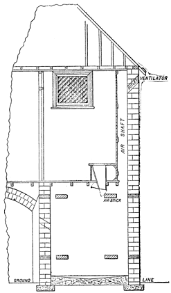 Vaults.—Water-tight cesspools should be constructed of hard-burned brick, laid in cement, and having a similar brick or a concreted bottom. The inside and outside surfaces of the brick wall should be coated with a thin layer of cement, and clay rammed in around the wall, to increase its imperviousness to water. It should be vaulted « 12 » above, and topped by a square or round central opening, covered with stone or iron plate. Cesspools are also made of cast or wrought iron, the joints being made water-tight. Cesspools must be ventilated by two pipes, one rising several feet above ground, the other carried to the roof of the house, barn, or other structure near by. The current will, in most cases, tend down the short and up the long pipe. The latter may be dispensed with and the soil pipe of the house act as a flue, provided all branches are perfectly trapped.