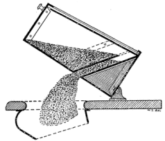 In Europe, the use of earth and ashes has been superseded by peat dust. The upper layer of peat is dried in the air and ground in a suitable machine. The coarser particles are removed by sifting and used for bedding in stables. The fine portion, which has a very high absorbing power for fluids and is also capable of preventing odors, is used in dry closets. In Germany there are at present about thirty factories engaged in the preparation of peat moss for the purposes mentioned. Its great advantages over dry earth should bring it into use in our country. (See fig. 5.)