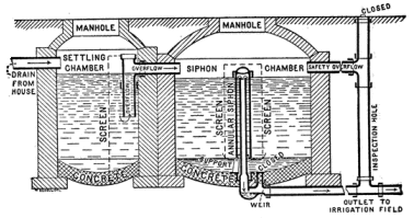 Two adjoining water-tight receptacles of brick. One of these receives « 13 » the sewage from the house and is intended to act as a settling chamber for the coarser particles, paper, etc. This communicates with the second receptacle, which receives from it the fluid sewage. This chamber is called the flush tank and is provided with a siphon. When the fluid has reached a certain level, the siphon is set in operation and discharges the contents of the chamber at one time into the subsoil pipes.
