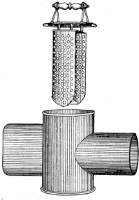 Garbage is of much less annoyance in the country than in the city, « 16 » where its collection and destruction is a great expense, and is frequently very unsatisfactorily done. In the country, the household garbage is fed to the swine and poultry, and is in this way profitably used. There are, however, homes where garbage must be taken care of in other ways. It may be buried in the garden or else burned in the kitchen range. Recently a device has been patented which enables the housekeeper to place the garbage in a section of the smoke pipe of the range, where it dries out rapidly, burns, and leaves only a little charcoal behind, which may be used for fuel next day. This device has been well recommended by sanitarians (see fig. 8).