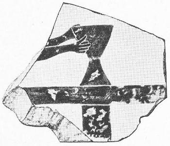 The process of the figure painting was as follows: the outlines of the figures were indicated outside the spaces intended for them, first with a narrow line, then with a broader contour stripe; then the details within the red silhouette, and sometimes the outlines, were painted in black glaze lines; finally the background was filled in with the black glaze.