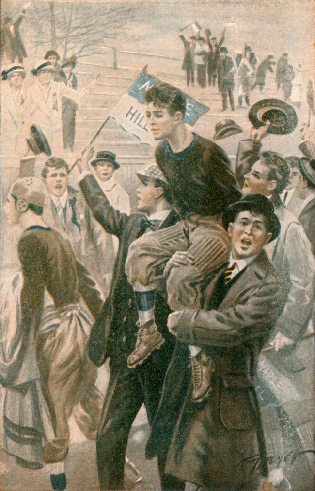 After that it was all very confused. Rodney trotted back up the field and someone, he never remembered who, tried for goal and missed it badly. And then the teams lined up again and,[302] after the first play, the final whistle blew and he was trying to make his way through the crowd that suddenly flooded the field. Hands seized him and arms lifted him aloft and he went swaying uncertainly about on the shoulders of three shrieking, happy youths whom he didn’t even know by sight. Once, as they passed the almost deserted south stand he caught sight of the twins, waving, laughing. One of them—he never knew whether it was Matty or May—blew him a kiss. Then he lost sight of them again. Cheers filled the air. Swaying unsteadily, following a line of other captured players, Rodney smiled happily. At last, he told himself, he was something more than just the Brother of a Hero!