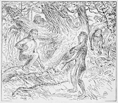 Koree started to the rescue of the woman, but, in the tangled underbrush could not find her; but, instead, he ran against a gigantic ape, which had also been startled by the cries, and, in his fright, was running about in confusion. This ape gave Koree a powerful blow with his fist, and then ran out of the swamp to where the child was playing. Seizing the child he next ran with it into the bushes and was out of sight.