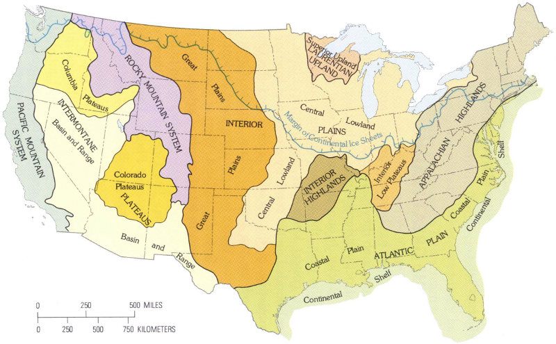 Figure 2.—Physical divisions of the United States and maximum extent of the continental ice sheets during the Great Ice Age.