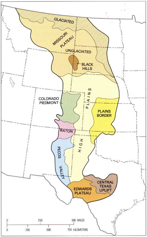 The High Plains extends southward from the Pine Ridge escarpment, near the South Dakota-Nebraska border (fig. 3), to the Edwards Plateau in Texas. The Platte, the Arkansas, and the Canadian Rivers have cut through the High Plains. That part of the High Plains south of the Canadian River is called the Southern High Plains, or the Llano Estacado (staked plain). The origin of this name is uncertain, but it has been suggested that the term Llano Estacado was applied by early travelers because this part of the High Plains is so nearly flat and devoid of landmarks that it was necessary for those pioneers to set lines of stakes to permit them to retrace their routes.